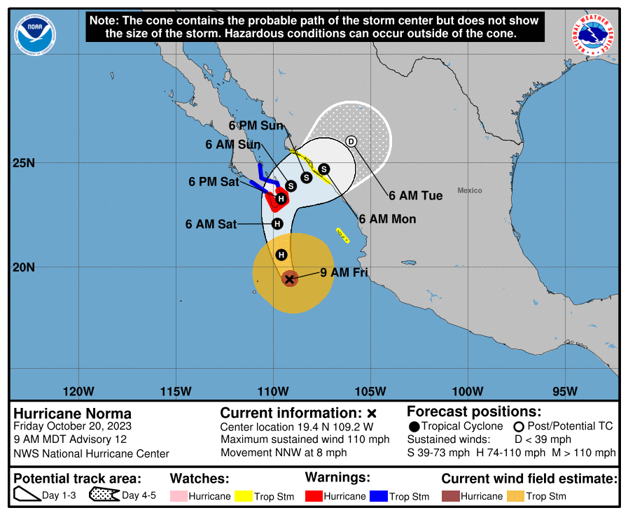 A hurricane warning was issued for the southern tip of the Baja California Peninsula, but even a minor deviation from the forecast track would take a weakened Norma toward the mainland of Mexico’s western Pacific coast.